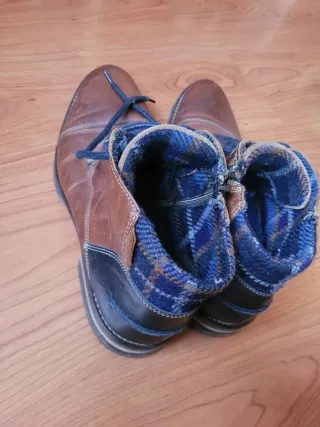 Botines de piel en color marrón, perfectos para el frío. - Forro interior de lana, cuadros escocés. - Cierre con cordones. - Cierre con cremallera interior