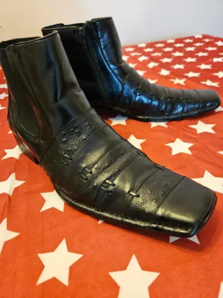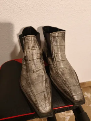 Botines para caballero con un diseño moderno y elegante. - Imitación piel con textura de elefante. - Diseño en punta cuadrada. - Cierre elástico lateral. - Poco usadas y listas para darlo todo.