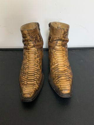 Botines Sendra con un diseño único. - Piel de Serpiente Pithon auténtico. - Color marrón. - Cremallera lateral para facilitar el calce. marcan talla europea 41, pero yo uso un 42- 43 y van perfectas.