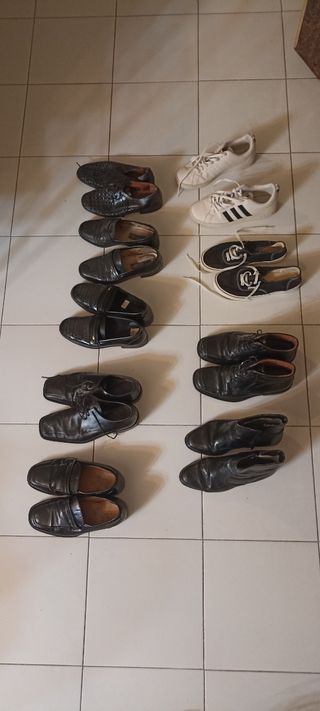 Pack de zapatos de vestir y zapatillas deportivas. Todo el pack por 50€. - Zapatos de vestir/piel negros vintage. - Botines de piel y forrados por dentro. - Zapatillas deportivas blancas marca adidas.