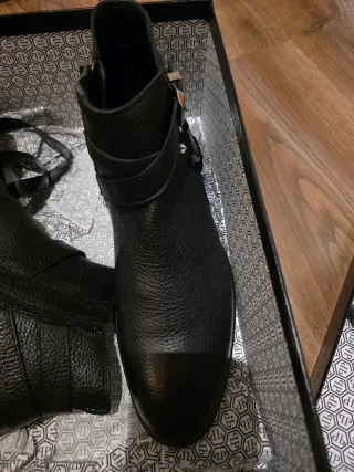 Botines de cuero con cremallera lateral. Nunca usados por equivocación de talla. Están en perfecto estado con sus etiquetas, muy buena piel. La talla es una 44 Todos los detalles en las fotos