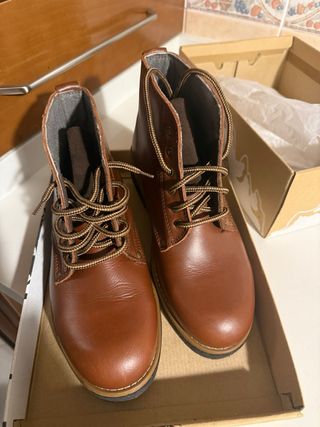 Nuevos a estrenar con etiquetas. Talla 39. Botines de piel auténtica para chico en color marrón. - Piel legítima. - Cordoneras de cuero. - Forro interior de franela. - Suela antideslizante. NO hago cambios ni envíos, recoger por mi zona.