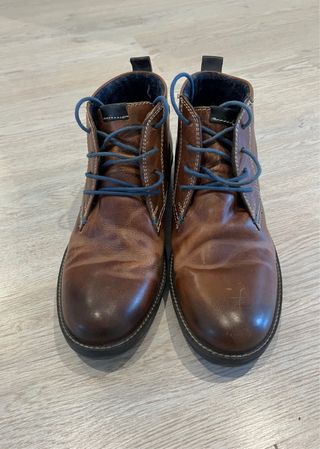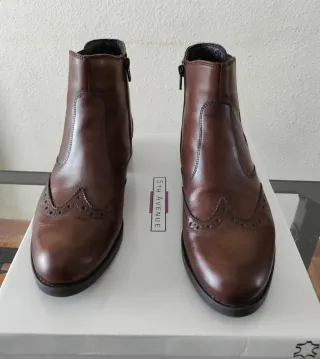 Botines de piel de la marca Dustin, a estrenar. - Color marrón. - Diseño tipo brogue. - Cierre con cordones. - Forro interior azul. - Talla 44-45