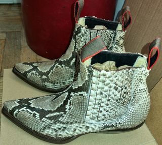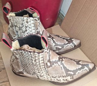 Botines Piel de Piton, nuevos a estrenar, sin caja. Botín de cuero Bufalo de pitón natural con elástico lateral, con el acabado cowboy. Con horma de punta y tacón cubano. No se aceptan cambios. No se aceptan devoluciones.