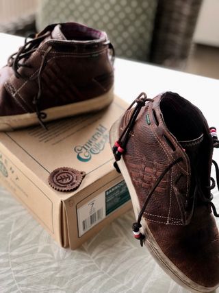 Zapatillas marrones de piel combinado con ante/serraje. Cordones marrones planos Suela de goma. Algunas marcas del uso por los talones como se observa en las fotos, por lo demás bien, cuidados. Contactar sin compromiso, precio negociable. Dispongo de más zapatos y botines en mi perfil.