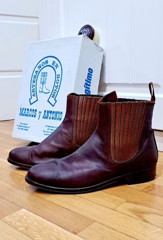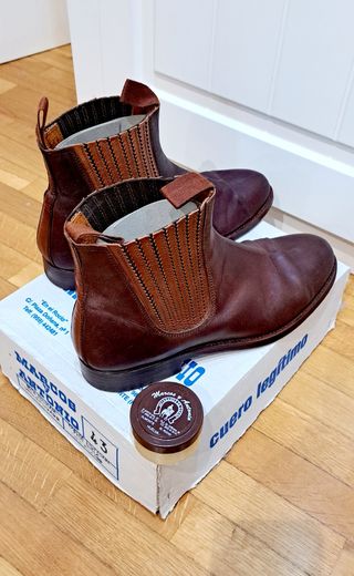 Botines para caballero auténticos de Valverde del Camino. Hechos de piel con su caja original y grasa para su conservación. Número 43. Muy poco uso y muy bien cuidadas.