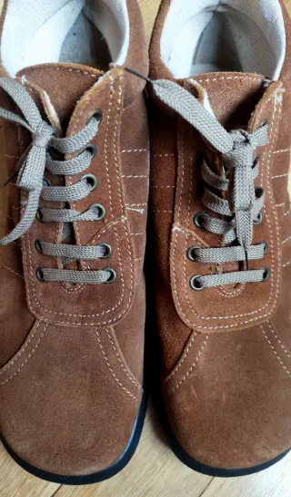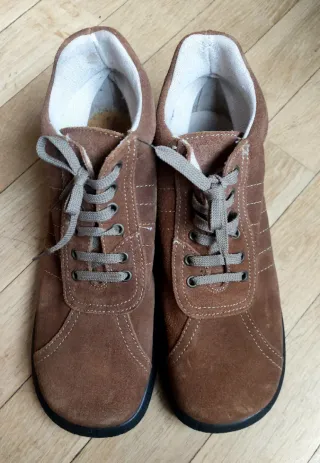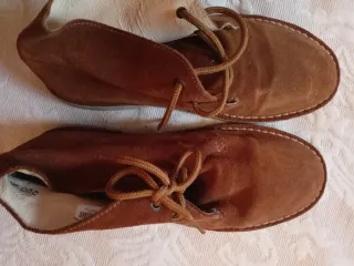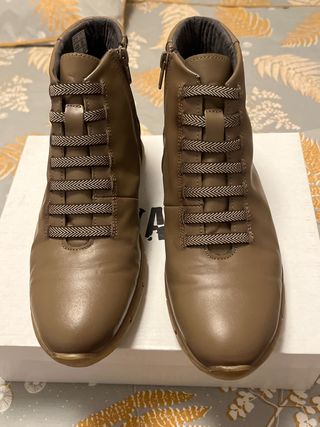 Botines de piel en color marrón, talla 41. Un calzado cómodo y versátil. - Material exterior de piel. - Cierre con cordones. - Diseño casual. Cómodos y anchos, tipo barefoot, los dedos quedan libres, sin apretar. Sólo puestos un dia, pues tengo un 41,5 y me quedan justos.