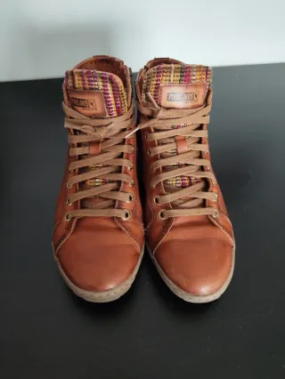 Botín de piel de la marca Pikolinos. La piel es de muy buena calidad, flexible y en muy buen estado. Suela ligeramente acolchada. Los botines son súper cómodos. El precio original son 120€ Está en perfecto estado porque me lo compré y lo usé muy poco porque cogí un número menos pensando que me iba a ir bien. - Diseño de caña media - Cierre con cordones y cremallera lateral. - Detalle de hebilla y correa. - Forro interior con estampado étnico.