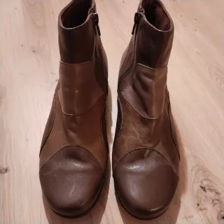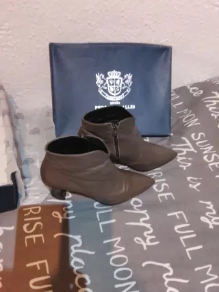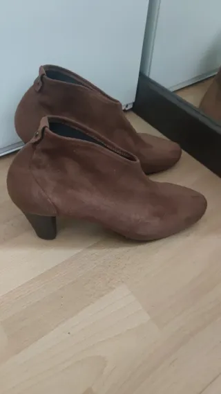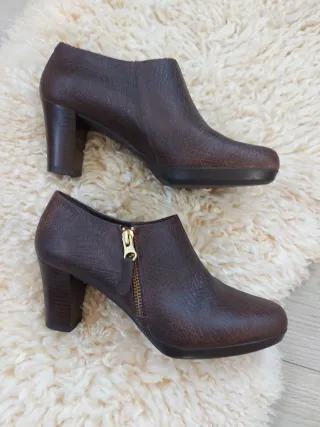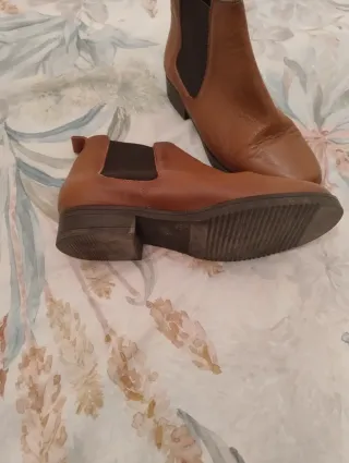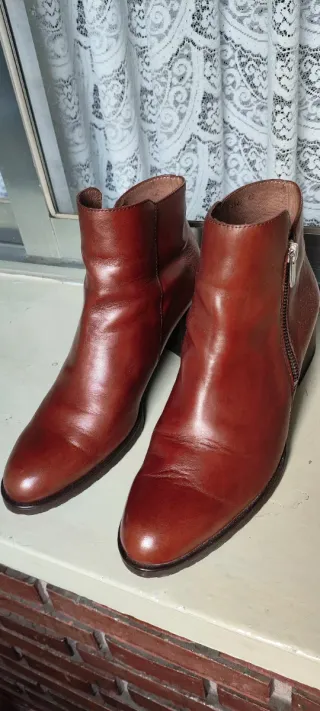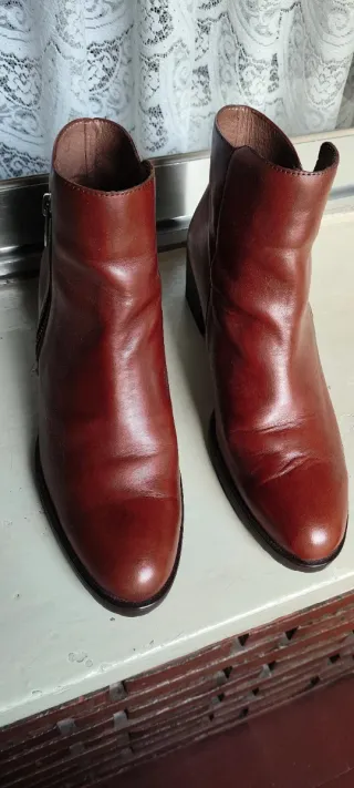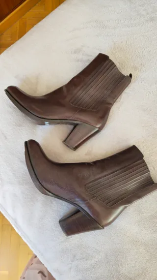 Botines de piel en color marrón. Un solo uso. Me los regalaron y me queda pequeños - Material exterior: Piel - Cierre lateral con cremallera oculta - Tacón cuadrado - Suela antideslizante