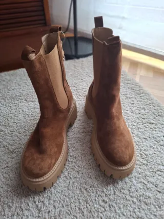 Botines estilo Chelsea, ideales para completar tu look. 100 % piel Ante color camel (cognac) A estrenar - Material exterior de ante. - Diseño elástico en los laterales. - Suela gruesa y resistente.