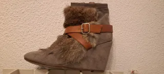 Botines de piel y ante con detalles de pelo. - Diseño en tonos grises y marrones. - Correa de piel con hebilla. - Tacón de cuña. Uno de ellos tiene un poco despegado el tacón. Ver foto. Por lo demás están en buen estado. Semi nuevos. No hago envío. Metro Alsacia. Madrid.