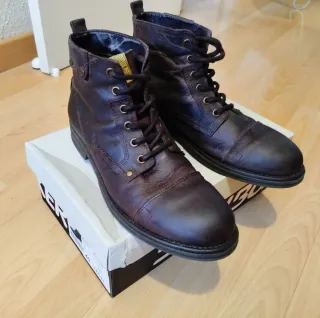 Botines Bullboxer para hombre, talla 40, de color marrón. Están hechos de cuero y tienen un estilo clásico. Son ideales para el otoño e invierno. Usadas en un par de ocasiones. - Piel con aspecto desgastado. - Cordones marrones. - Suela resistente.