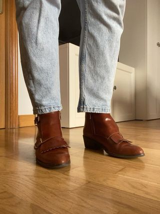 Botines de ante para mujer. - Diseño de estilo cowboy. - Punta afilada. - Tacón fino. Botas cowboy bajas confeccionadas en 100% piel. Motivos western con costuras a contraste. Altura del tacón: 5cm Impecables. Se usaron una tarde 10 minutos por quedar pequeños y se guardaron. Pasan por nuevos perfectamente. No tienen ni un solo desperfecto. Envios por Wallapop