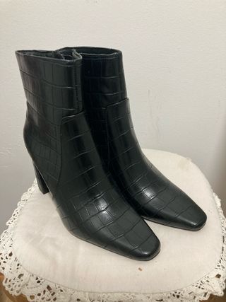 📝 Elegantes botines negros con un diseño moderno. Acabado brillante y efecto piel de serpiente con cremallera frontal y tacón cuadrado 🎨 Color negro 🏷️ Usados con algunas marcas de uso, tapas nuevas 🚫No hagas ofertas ni lotes si no estás seguro de comprar ¡Es una falta de respeto y de tiempo! Serás bloquead@ 🛍️ DESCUENTO EN LOTES 🤩 MÁS ARTÍCULOS EN MI PERFIL ⚠️ PRENDAS DESINFECTADAS 🙌 NO DUDES EN HACER UNA OFERTA 📦 ENVÍOS EN 24HRS ❓ CUALQUIER DUDA CONSÚLTAME 🧦👕👖👗👛👒👙🧣🧤👝👠🕶️