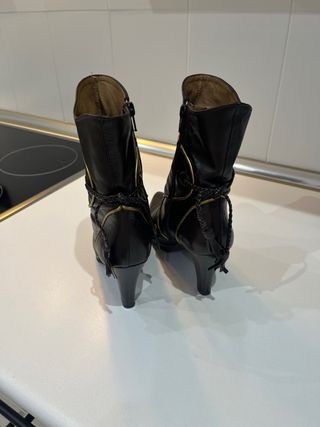 Botines únicos y peculiares de piel. - Diseño patchwork con múltiples texturas. - Cierre de cordones y cremallera lateral. - Tacón de altura media. - Detalles de costuras y adornos metálicos. -Los vendo muy a pesar mío porque me han operado los pies y se me acabó cualquier tacón.