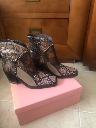 botines de tacon con talon de piel de serpiente, con uso pero en buen estado número 36. son de marca pero no me acuerdo es una M mayúscula.