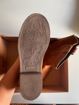 En piel de serraje marrón. Con cremallera dorada. Usados pero en buen estado. Tacón medio de 7,5 cm. marca Stradivarius