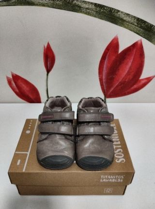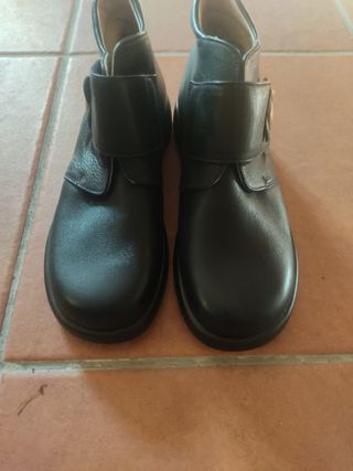 Botas de piel para niña con cordones, de punta redonda, caña baja. Cierre con cordones y con velcro. Se ha utilizado una sola vez. - Cierre con cremallera lateral. - Detalle de correa con hebilla. - Suela de goma antideslizante.