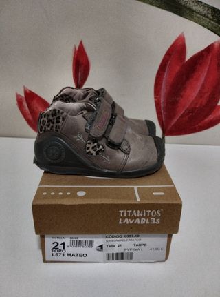 Botines de piel con un diseño moderno y elegante. - Cierre de velcro para un ajuste fácil. - Detalle de costuras blancas. - Suela resistente. - Se supone que es de niña, pero sirve perfectamente para adultos - Tiene un ligero relieve imitación serpiente - Su color es negro en su mayoría con un gris oscuro de fondo - No tengo su caja pero no sé han usado nunca más allá de probarlos en casa