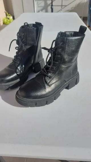 Botines de niña de estilo militar, de piel con cordones y cremallera lateral. - Material exterior: cuero. - Suela de goma antideslizante. - Talla 37. Solo 3 puestas.