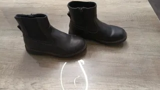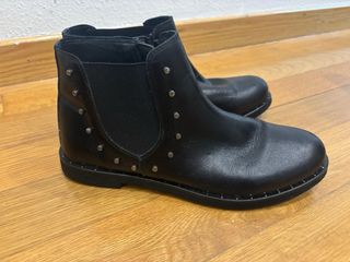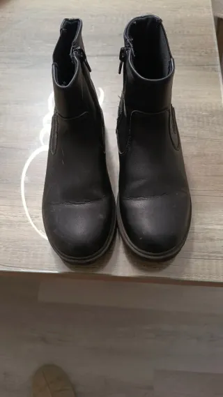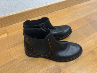 Botines de piel color negro para niña con un diseño moderno y detalles que las hacen únicas. - Cierre de cremallera lateral. - Correa con hebilla dorada. - Suela gruesa y resistente. - Puntas sin rozaduras Tengo otros calzados de otras tallas en mi perfi además de abrigos para chicas.