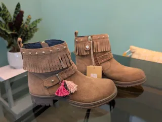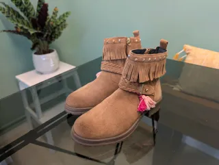 Botas estilo cowboy para niña. - Diseño con flecos. - Material de piel con detalle de serraje. - Cierre con cremallera lateral - Plantilla flexible - Suela de goma Los vendo porque se me pasó el plazo de devolverlo. Están sin estrenar. En Zara valen 45,99€