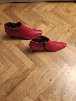 Elegantes y llamativos botines de cuero rojo de la marca Ciao Ragazzi, talla 39. Un diseño femenino y original con punta abierta y tacón de madera que aporta un toque moderno y sofisticado. Fabricados en cuero auténtico, suaves y cómodos. Presentan señales normales de uso, pero se mantienen en buen estado y siguen siendo una pieza muy especial para cualquier outfit. Detalles: • Marca: Ciao Ragazzi • Talla: 39 • Cuero auténtico • Diseño peep toe (punta abierta) • Tacón de madera resistente • Color rojo intenso, muy elegante Perfectos para combinar con vestidos, vaqueros o looks de verano. Un modelo diferente que destaca