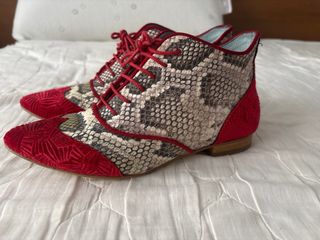Botines de la marca De flores y floreros con un diseño único. - Combinación de piel con estampado de serpiente y ante rojo. - Detalle de bordado en la punta. - Cierre con cordones rojos. - Forro interior azul.