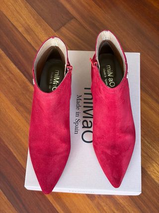 Botines de piel rojos con tacón, nuevos a estrenar. - Diseño elegante y llamativo. - Cierre con lazo de terciopelo negro. - Tacón medio,estilo chupete.