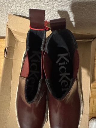 Botines estilo Chelsea de la marca Kickers en color rojo. Cuentan con elásticos laterales para facilitar su puesta y una suela gruesa y resistente. - Diseño moderno y versátil. - Material exterior de piel. - Detalle de etiqueta de la marca.