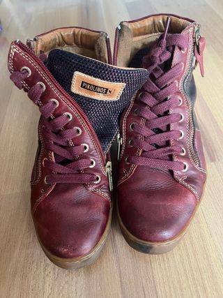 Botas de piel Pikolinos en tonos rojos y marrones. Cierre de cordones y cremallera lateral. - Diseño tipo botín. - Detalle de pespuntes. - Suela de goma.