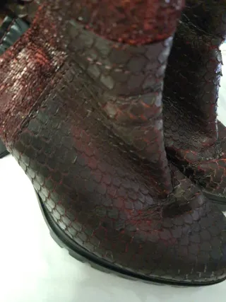 Elegantes botines de piel con un diseño moderno y detalles únicos. Cuña de 6 cm. En buen estado. Talla 41. - Acabado en piel de alta calidad. - Combinación de colores rojo y plata. - Detalle de textura imitando escamas en la puntera. - Tira metálica decorativa en la parte delantera. - Cierre lateral con cremallera.