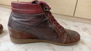 Botas bajas o botines de piel color marrón con cordones rojos. Talla 43. Marca Dorothy Gaynor. En perfectas condiciones de plantilla y sin desgaste de suelas y tacones. Buena sujeción del tobillo. Hago envíos y lotes de productos. Entrega en persona en Madrid, Jerez y bahía de Cádiz.