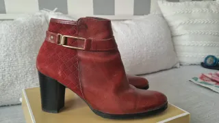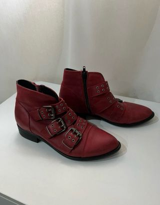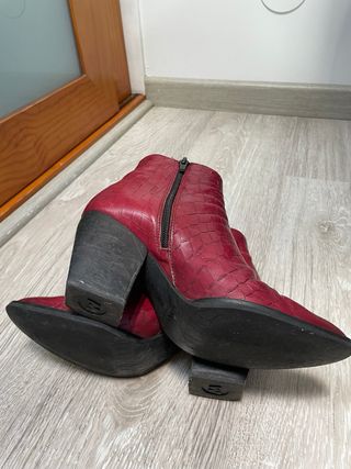 Botines de piel en color rojo, talla 37. Un diseño elegante con detalle de hebilla. Solo puestos un rato. Pequeño arañazo que se ve en la foto. - Material exterior: Piel. - Cierre lateral con cremallera. - Tacón grueso, muy cómodos.
