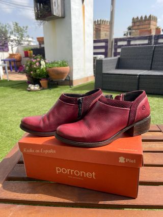 Botines de piel de la marca Porronet en color rojo. - Cierre con cremallera lateral. - Detalle de tejido elástico en el cuello. - Tacón bajo y cómodo.