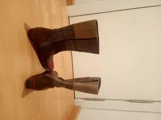 Botines originales de la marca Hispanitas. - Fabricados en piel. - Combinación de colores marrón y rojo.
