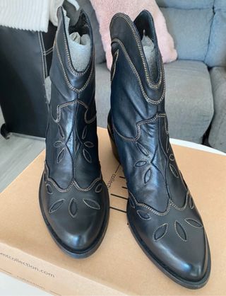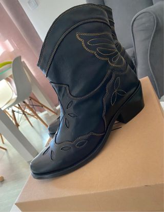Botines de piel con un diseño moderno y elegante. Precio original: 94,90€ - Sin estrenar. - Detalle de costuras doradas. - Corte estilo cowboy.