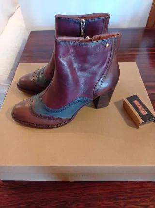 Botines de piel Pikolinos en talla 40. Combinan tres tonos para un diseño único. - Piel de alta calidad. - Diseño con detalles de picado. Tacón 8 cm. - Cremallera lateral para facilitar el calce. - Suela interior mullida confort