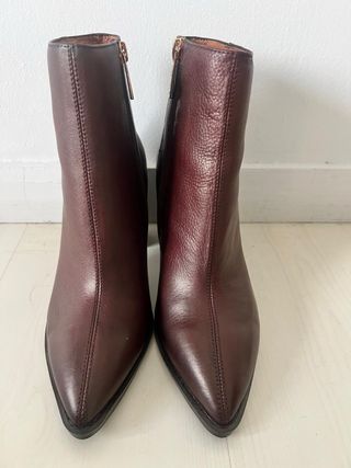 Botines de piel en color burdeos y con cordones, talla 38. Excelente piel, suave y flexible. Muy poco uso, pero con algunas marcas habituales en una piel de esta calidad (se aprecian en las fotos). Precio original: 99 €.