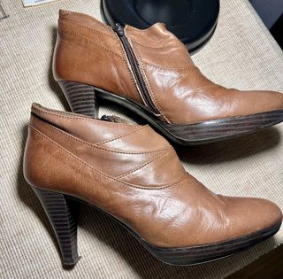 Botines de piel suave color camel . Marca Strover by Patricia Miller talla 38. Puestos una vez . Están impecables . La piel hace dibujos como si fueran costuras decorativas . Cremallera lateral. Alto de caña 11 cm . Tacón de madera de 8 cm pero lleva plataforma de 2 cm , por lo que se queda realmente en 6 cm ( bastante cómodos). Son preciosos . Tienen en los dos tacones por detrás ( fotos) unas marcas del único día que los use.