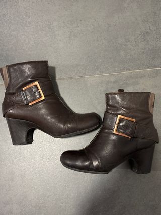 Botines de la marca Clarks en tonos marrones y negros. Un diseño elegante y versátil ¡Le hace falta plantilla interior! - Material exterior de piel. - Cierre de cremallera lateral. - Detalle de hebilla dorada