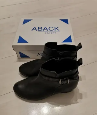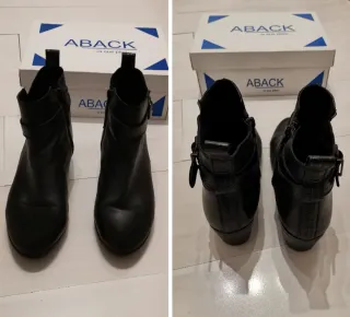 Botines piel auténtica de la marca aback fabricados en España Talla 39 color negro Modelo completamente en piel y con cierre de cremallera y hebilla Perfecto estado Se incluye su caja original