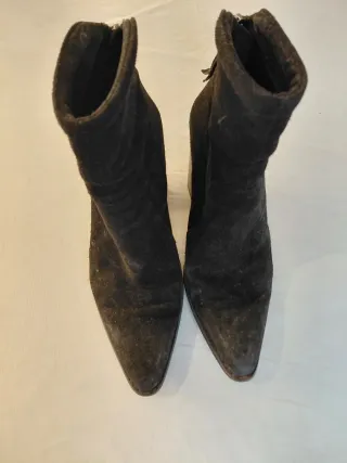 Botines de estilo moderno con un acabado que imita la piel de ante. Se ha usado muy poco: ver suela e interior. - Material exterior de poli piel. - Detalle metálico dorado en el tacón. - Punta afilada. - Tacón grueso y cómodo. La marca no aparece en el listado, realmente es zapshop.