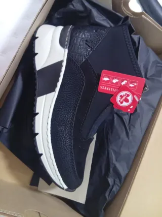 Botines Rieker de color negro. Presentan un diseño moderno y cómodo. - Material exterior con textura. - Detalle de material imitación piel de cocodrilo. - Suela blanca con plataforma.