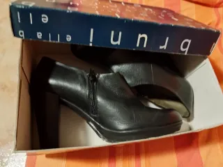 Botines de vestir de piel de la marca Elia Bruni - Tacón grueso. - Cremallera lateral. - piel -9cm de tacón. Son muy cómodos, el tacón es alto y de color negro. Sólo tienen un uso para una cena y se me rozó un poco la parte de atrás del tacón de uno de ellos. Es lo único que tienen. Se entrega con caja original que después de estar guardada en el armario, la tapa está un poco agrietada pero perfectamente funcional. Son de la talla 38