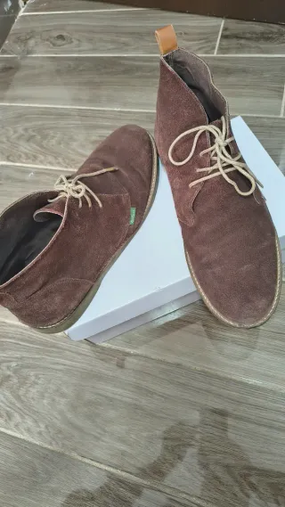 Botines de piel con un diseño moderno y versátil. - Material exterior de ante. - Cierre de cordones y cremallera lateral. - Suela de goma gruesa. Precio negociable