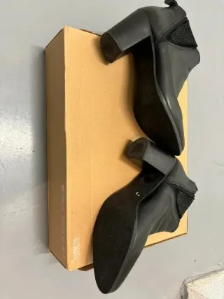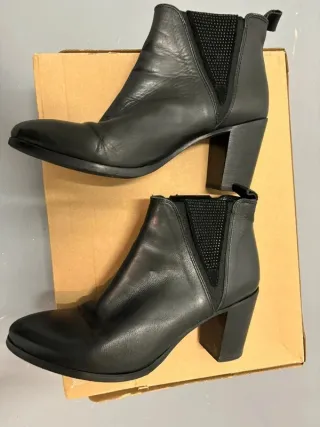 Botines de piel en color negro. - Cierre con cremallera lateral. - Tacón fino. - Punta afilada. - Hecho en España - Cómodos y casi nuevos, no puedo usarlos más por prescripción médica