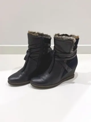 Vendo preciosos y elegantes botines de la marca Hispanitas, de piel auténtica en color azul marino (navy), perfectos para tu día a día y para vestir. Por desgracia para mi elegí mal la talla. Elaborados con piel de vacuno, ante y forro de pelo de alta calidad. El piso es tipo cuña de goma con excelente agarre y llevan cremallera lateral interior para un calce rápido y cómodo. Su precio original fue 139,99 € y se han usado un par de veces, por lo que están en excelente estado. Gracias por mirar!