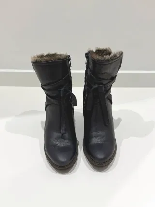 Botines de piel con un diseño clásico y elegante. Las he usado solamente una vez, son súper cómodas, se adaptan perfectamente desde el primer momento y son muy calientes ya que tienen forro interior de microfibra para el invierno. Suela antideslizante de goma en perfecto estado.