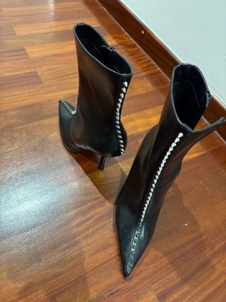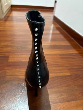 Botines de tacón alto con un diseño moderno y atrevido. - Acabado en piel sintética. - Detalle de tachuelas plateadas a lo largo de la caña y la punta. - Punta afilada. - Tacón de aguja. Se usaron una sola vez y muy poco tiempo, se puede ver en la tapa del tacon el poco uso